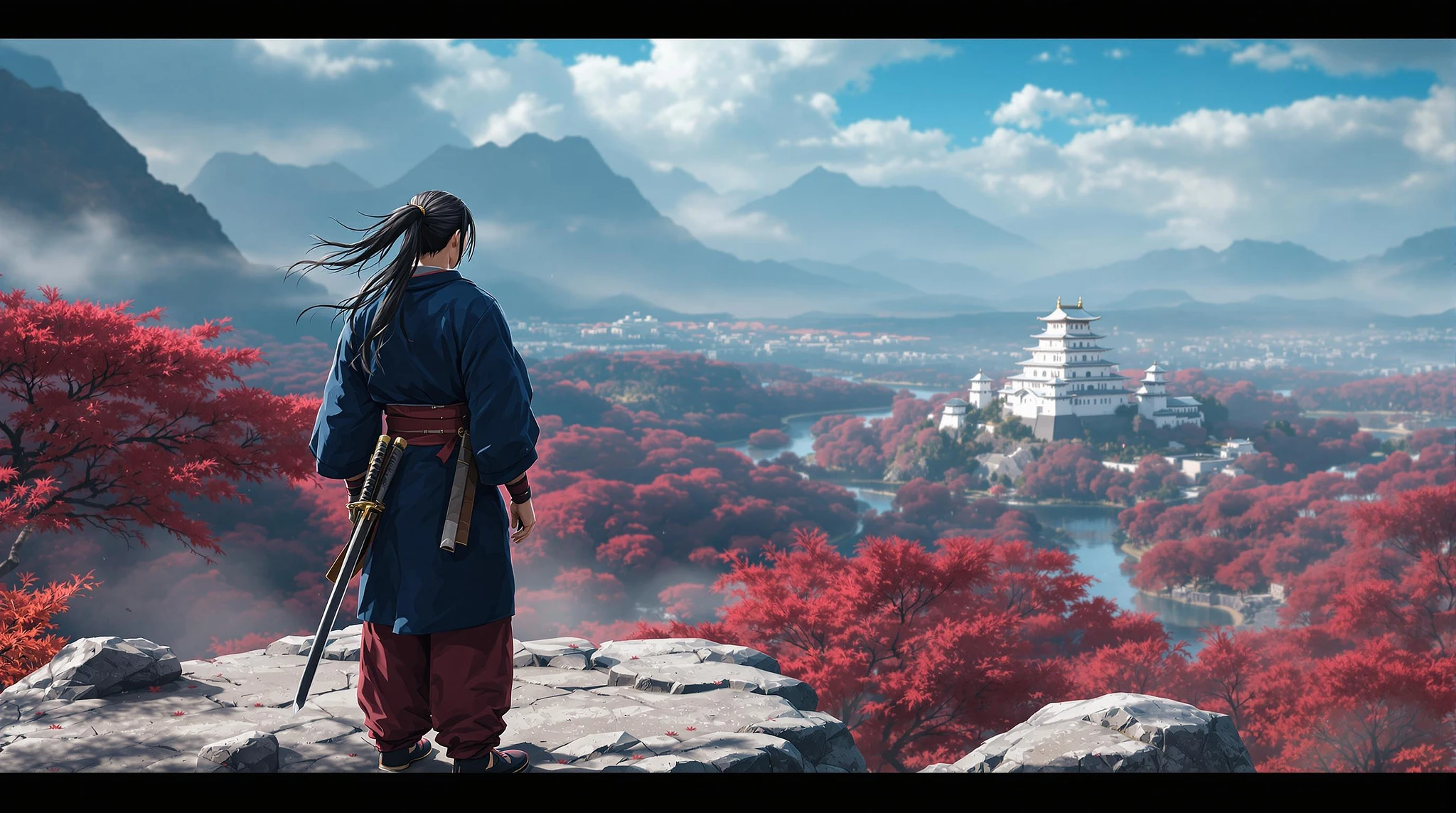 a lone samurai standing on a rocky outcropping, gazing out at a breathtaking landscape. The samurai has black hair tied back in a ponytail, with a few loose strands framing his face. He wears a blue kimono with a red sash and red pants, with a sword at his side and a scabbard on his back. The background features a serene landscape with red trees, a stream, and mountains in the distance. A white structure resembling a castle or temple is visible in the distance, with a blue sky above. The wide-angle camera perspective captures the expansive scenery, with the samurai at the forefront.