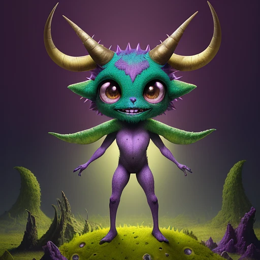 cartoon of a colorful creature, big eyes and big teeth, big horns, light bronze and purple schema, moss on the ground, spiky mounds, humorous tone, full body, strong facial expression, minimalist atmosphere, light colored empty background, wide shot, fantasy, illustration, alejandro jodorowsky comic style