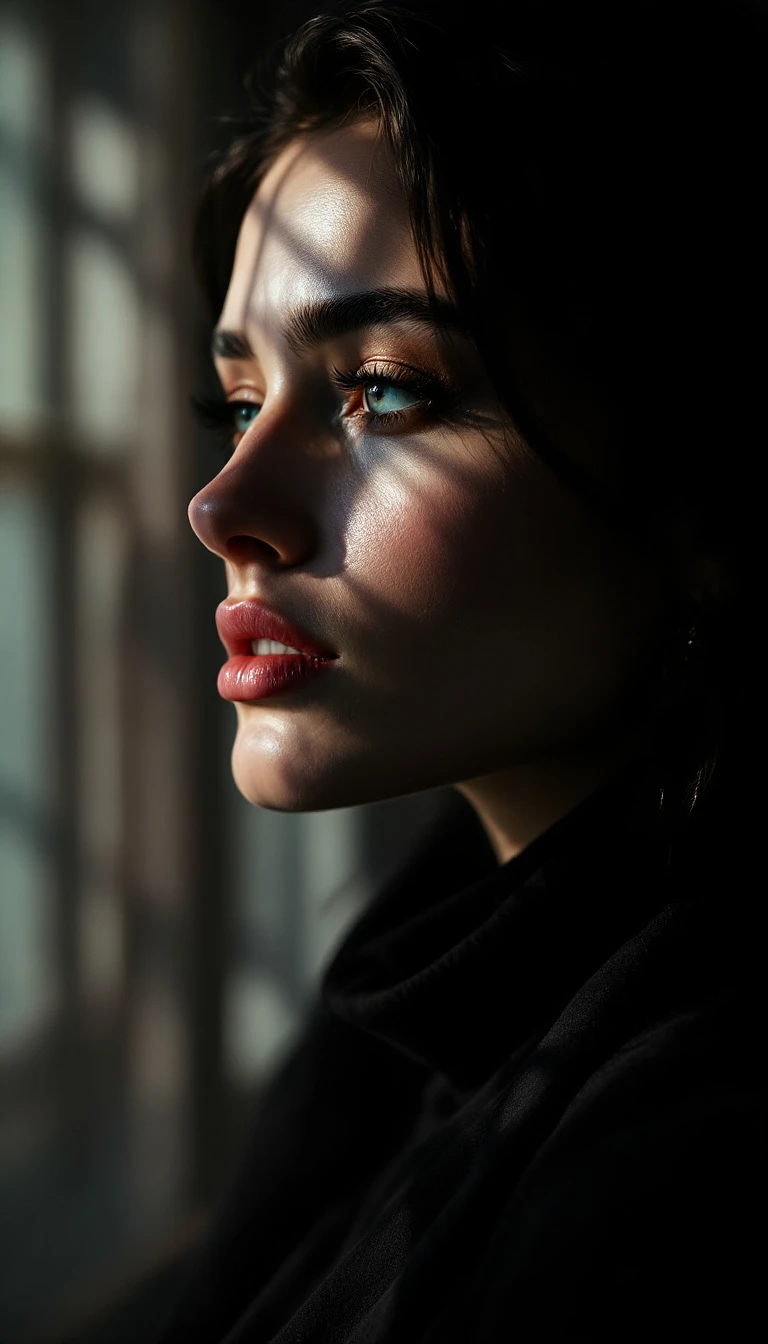 high-resolution photograph, woman, stunning use of shadows, in the syle of crisp lines and forms, UHD, shot on a Sony A7III --ar 1:2 --style raw --stylize 250