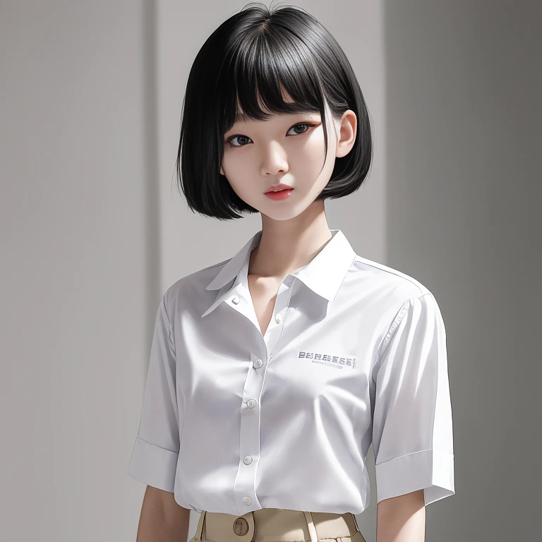 (1girl) , Beautiful Korean woman, K-pop idol, (Cute Loose Bob hairstyle) , (wearing a button-up white shirt) , (wearing a Burberry skirt) , (small breasts) , symmetrical eyes, (aegyo sal:1) , (eyelashes:1.1) , (photorealistic:1.4) , 8k, ultra highres, hyperrealism, dramatic lighting, photography, beautifully detailed face, beautiful detailed eyes, physics-based rendering