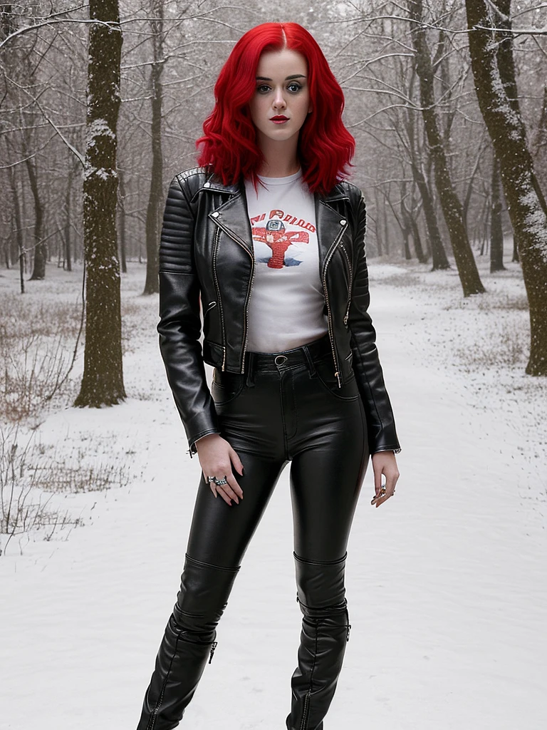 Katy Perry wearing a leather jacket leather jeans and leather highboots, with her red hair, standing in a snowy dark forrest