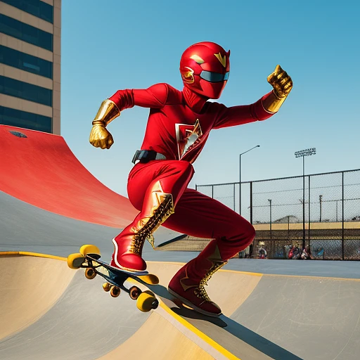 a red suited superhero, with a power ranger helmet baseball cap backwards, wearing sunglasses, gold boots and gold gloves riding on a skateboard, flying off a skate ramp like a rocketship superhero.