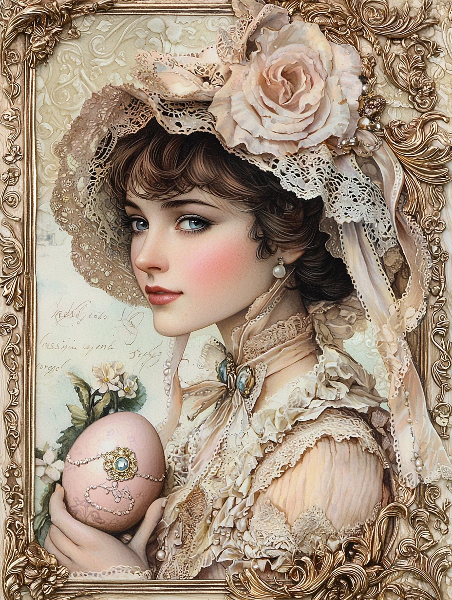 Hand-drawn vintage Easter junk journal page, embossed paper texture mixed media collage, layered with Victorian wallpaper patterns, embossed golden frames, and calligraphic Easter greetings, featuring elegant ladies in lace bonnets holding pastel-colored eggs, decorated with silk ribbons, pearl accents, and antique cameo brooches, in a color palette of soft rose, ivory, and pale gold. The artwork has an opulent and regal feel, with distressed metallic leafing, delicate hand-stitched borders, and aged parchment hues, resembling authentic vintage Easter greeting cards with timeless elegance. --q 2 --s 250