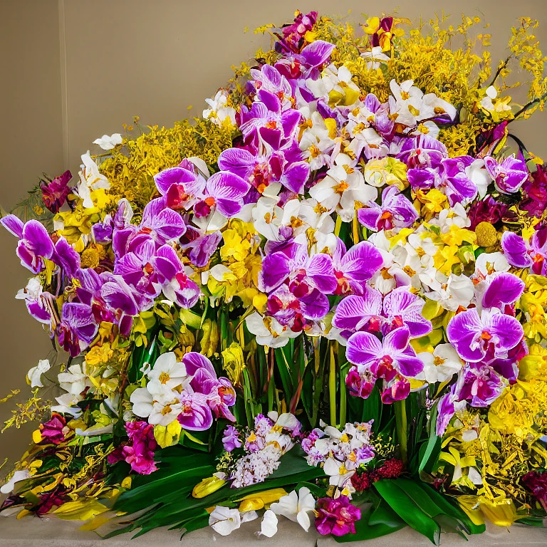 wide angle photograph of a large and bountiful orchid and wild blossoms arrangement being displayed:: flowers are art nouveau:: flowers are vibrant and beautiful, flowers are mostly golds, ochre yellows, crimson reds, violets and muted pinks:: flowers are made of crumpled paper and silk:: 8k high resolution --ar 1:3