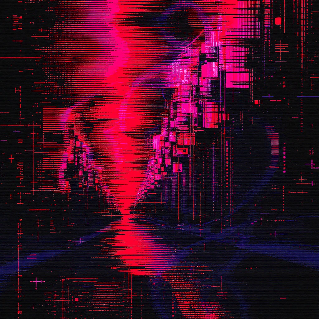 Heavy digital distortion, glitch art aesthetic, oversaturated reds and purples, corrupted data visualization, pixelation artifacts, analog interference patterns, chromatic aberration, VHS distortion, digital decay, wavelight hint interference patterns, light hint of misty slugs, many slugs, millions of slugs