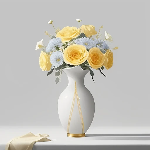 A stunning illustration of an ultra-minimalist design, featuring a captivating and ethereal vase of flowers. The vase, with delicate lines, is set against an off-white background. The flowers within the vase are rendered in subtle shades of light grey, gold, and blue, with a touch of watercolor-like yellow filling. The overall composition exudes tranquility and serenity, creating an atmosphere of calm and elegance. , illustration