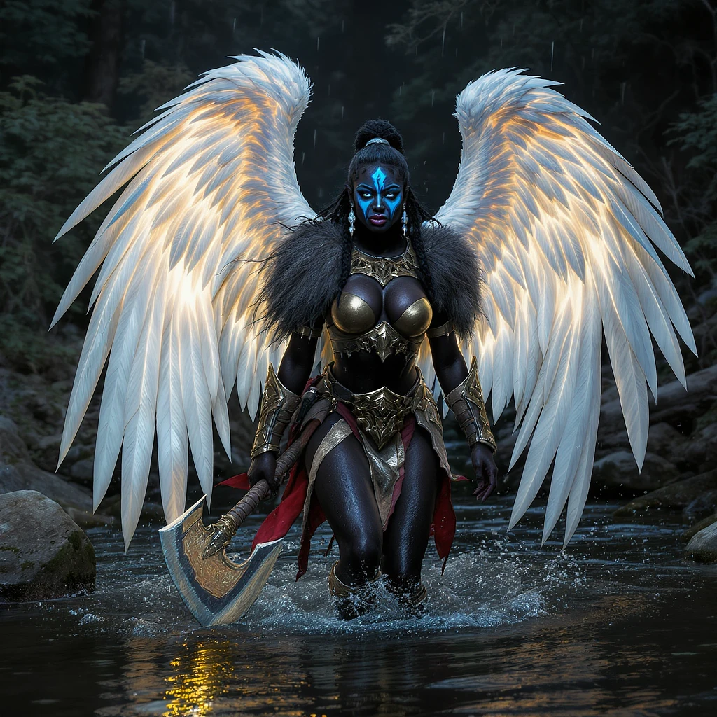 Full body shot of a black African female barbarian dressed warrior wearing blue face paint and gold cast breast plate , holding a battle axe, blue eyes , with massive white glowing wings wading through a stream in a forest in twilight in the style of Boris Vallejo and Pino Daeni --chaos 35 --ar 4:5 --stylize 750 --v 6. 1