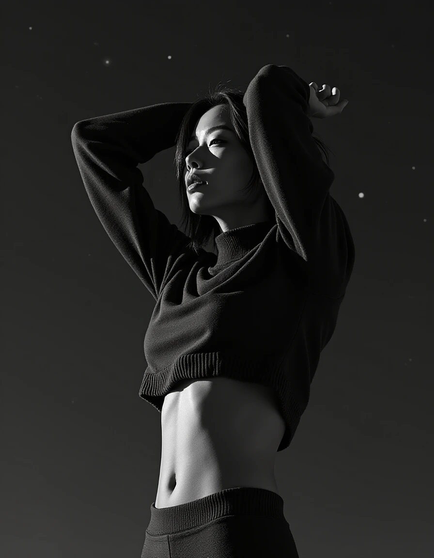 monochrome High fashion photo of a 24 year old asian female radiant yoga instructor, Porcelain skin that’s smooth but easily flushed, especially in cold or wind, natural with no make up, the skin pores and texture are clearly visible and in focus, Toned triceps with a gentle, defined contour, small breast, flat chest, with Choppy bob with tousled layers haircut, with body/eyes.
