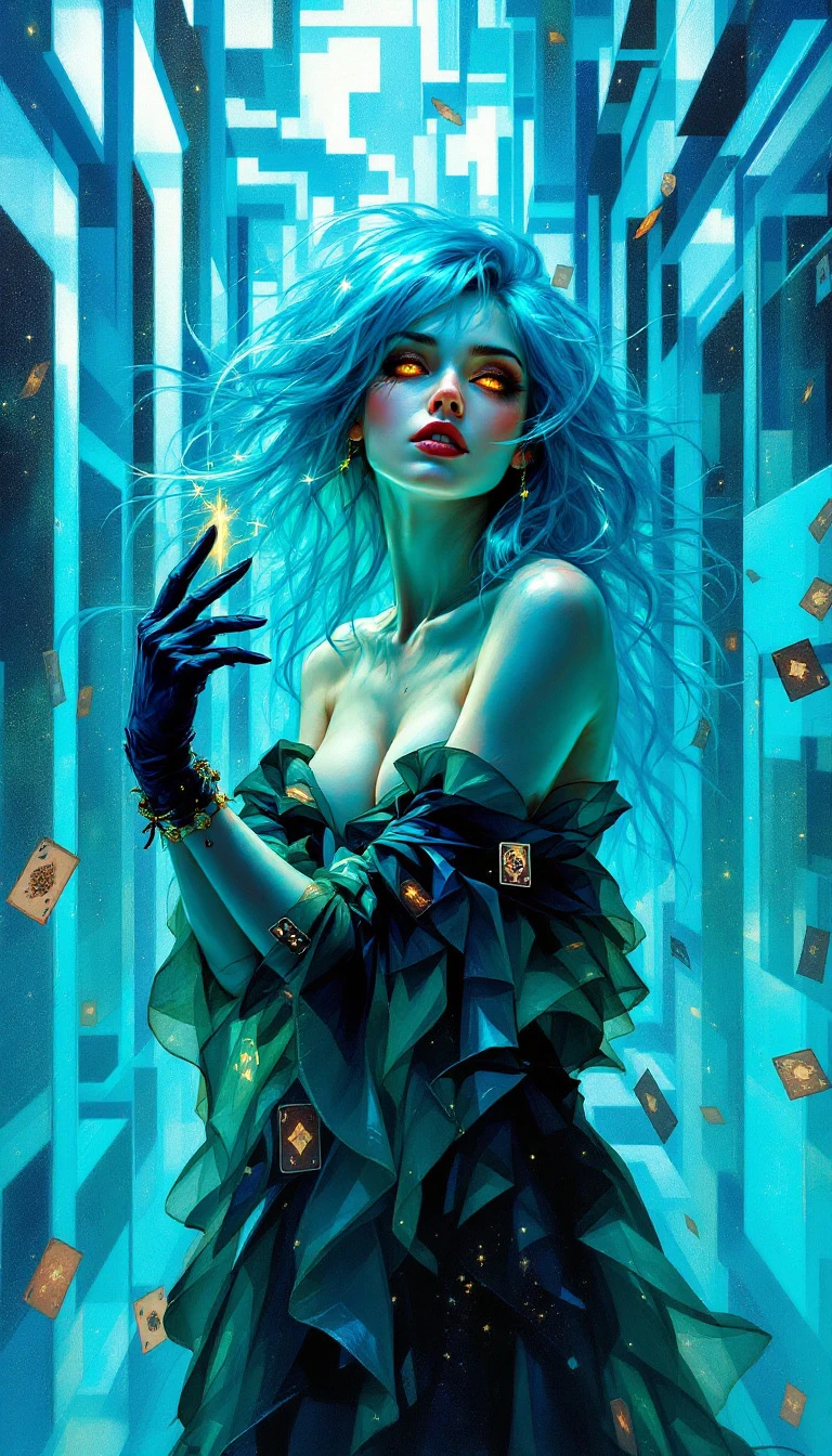 "Turquoise Illusionist in a Labyrinth of Light": A compelling abstract painting showcases an illusionist, with a blend of skill and a touch of ethereal mystery. She is a master of deception, depicted within a maze-like space of mirrors and glowing projections, with fair skin, long, flowing turquoise hair that seems to shift and move with the light, and a layered, flowing gown with reflective surfaces. Playing cards, wands, and other tools that are used to create illusions are attached to her sleeves and held in her gloved hands. The artwork combines modern abstraction and character depiction, creating a unique and intriguing scene using tones of blues, greens and silvers. Her watchful amber eyes, the focal point of the piece, convey both a mischievous nature and a sense of quiet power. After a night spent creating incredible deceptions, the illusionist embodies both artistry and a love for the mysterious. The luminous patterns and dynamic reflections invite the viewer to discover the hidden narratives within this vibrant work rendered as a painting.