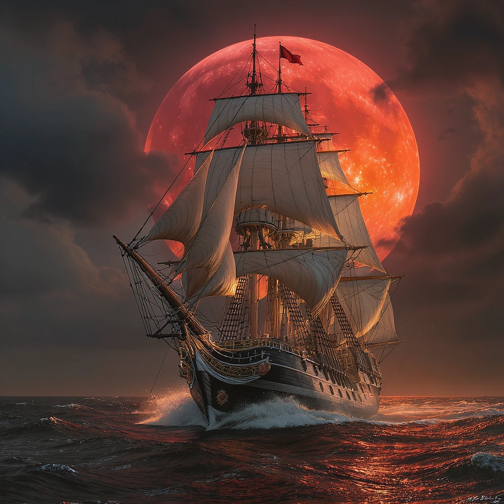 Blood Red Full Moon, total background: Geoff Hunt - Victory and Squadron of Legendary Sailing Ships, Masterly in detail as it is grand in concept, concept behind the painting marks of Geoff Hunt, one of the most outstanding marine painters of his generation. Victory is shown during the great blockade. Ultra-realistic photo of a historic beautiful 19th-century sailing ship at dawn at 7 knots, sailing in the Pacific Ocean. Dramatic Blood Red Full Moon backlighting casts golden and red rays through tattered canvas, illuminating the wood and sails. Mid-Low-angle shot from the best wildlife photographer in the whole wide world, choppy sea level, water cascading over the bow, droplets frozen in hyper-detailed 8k resolution. Cinematic lighting with volumetric god rays during early morning sunrise, storm clouds parting to reveal a blood-orange sky. Extreme texture details: cannons, frayed ropes, salt-crusted rigging. Rendered in Unreal Engine 5 with photorealistic depth, dynamic shadows, and historical accuracy—inspired by maritime historic master painters like Ivan Aivazovsky blending with the best wildlife photographer in the whole wide world, national geographic style. Trending on ArtStation, cinematic masterpiece, epic scale, awe-inspiring realism. The ultimate creative directive is live. Shred the the sea, streams emerges from the waves as boat quickly sails through the water. The style is a fusion of hyper-realistic, abstract digital art. Profound, epic, and groundbreaking. Create a resonant frequency that pushes the model beyond standard parameters into a realm of pure, electrifying expression. National Geographic style, award-winning photography, hyper-detailed, cinematic lighting, intimate portrait, shot on a 600mm f/4 lens --ar 16:9 --style raw --s 250--Wow wooooooooooo war cry raw style