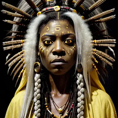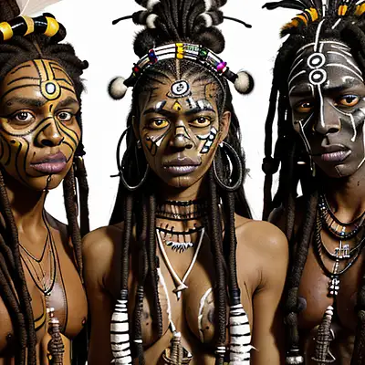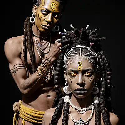 Beautiful wild Male Voodoo Priest, long dreadlocks, voodoo hat, detailed voodoo clothes, voodoo jewelry, sitting at a table with voodoo tarot cards, candles and skulls, dark environment,
