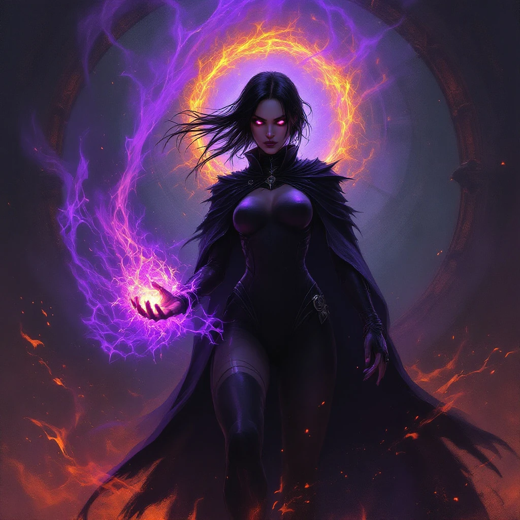 simple painting in the style of warhammer 40k of a female psyker, standing infront a gothic circh, channeling pruple and orange hellfire magic, cybereyes, black tight onepiece suit, mantle with high collar, black hair, latina skin