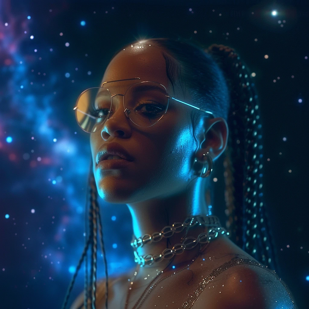 Rihanna sings in space, hyper realistic, celebrity-portrait, mashuo of style, cinematic light, smooth and shiny, 8k --s750