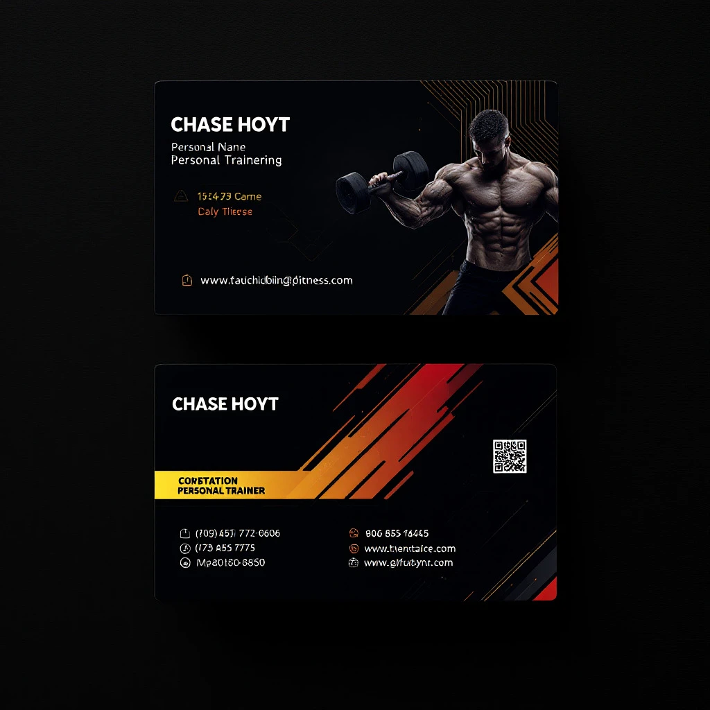 Create a business card for a personal trainer named Chase hoyt with a fitness related theme