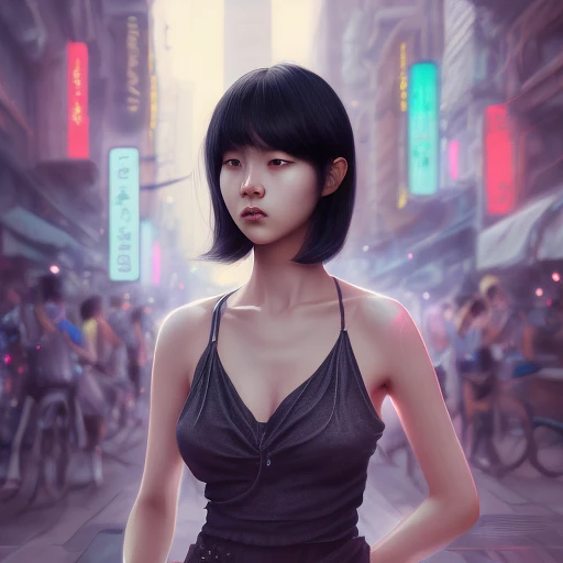 black hair, a portrait of a young south korean girl with medium length black hair, highly detailed face by greg rutkowski and magali villanueve, beautiful eyes, small breasts, toned body, cinematic lighting, neon lit street background, Hyperrealism, photography,