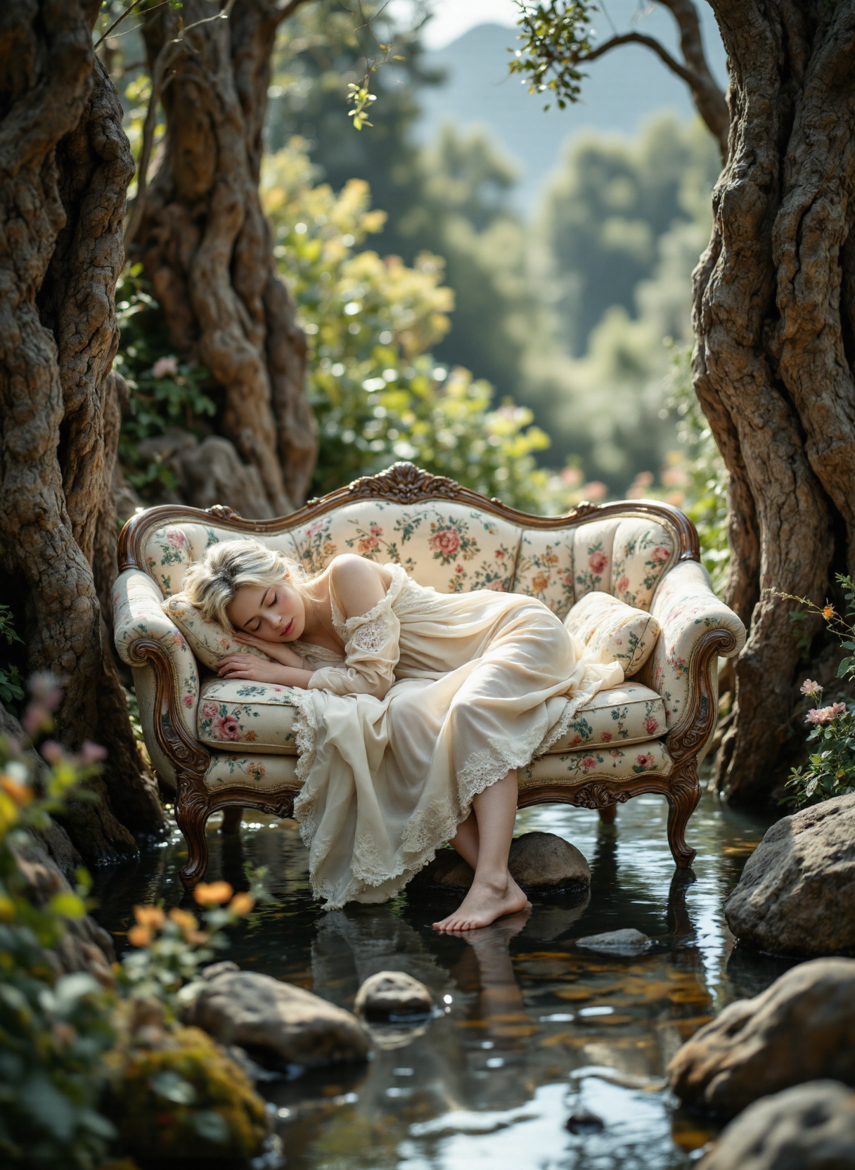 The image depicts a serene and whimsical scene where an elderly woman is peacefully sleeping on a vintage-style 19th century sofa. The sofa is upholstered in a light, floral-patterned fabric and has ornate wooden armrests and legs. The woman is dressed in a light-colored, flowing dress with intricate embroidery along the hem. She is barefoot, with her feet resting on a small rock in a shallow pool of water. The setting appears to be an enchanting, nature-filled environment. The sofa is positioned between two large tree trunks, which frame the scene like natural arches. The background reveals a lush, green landscape with towering trees and misty mountains, creating a sense of depth and tranquility. The foliage is dense and vibrant, with various shades of green and some hints of yellow, suggesting a mix of evergreen and deciduous trees. The water surrounding the sofa is clear and reflects the surrounding greenery, adding to the overall peaceful and dreamlike atmosphere of the scene. The rocks in the water are irregularly shaped and covered with small patches of moss and plants, enhancing the natural and untouched feel of the environment. Overall, the image conveys a sense of calm, serenity, and timeless beauty, blending elements of nature with the comfort of a cozy, vintage-style sofa.