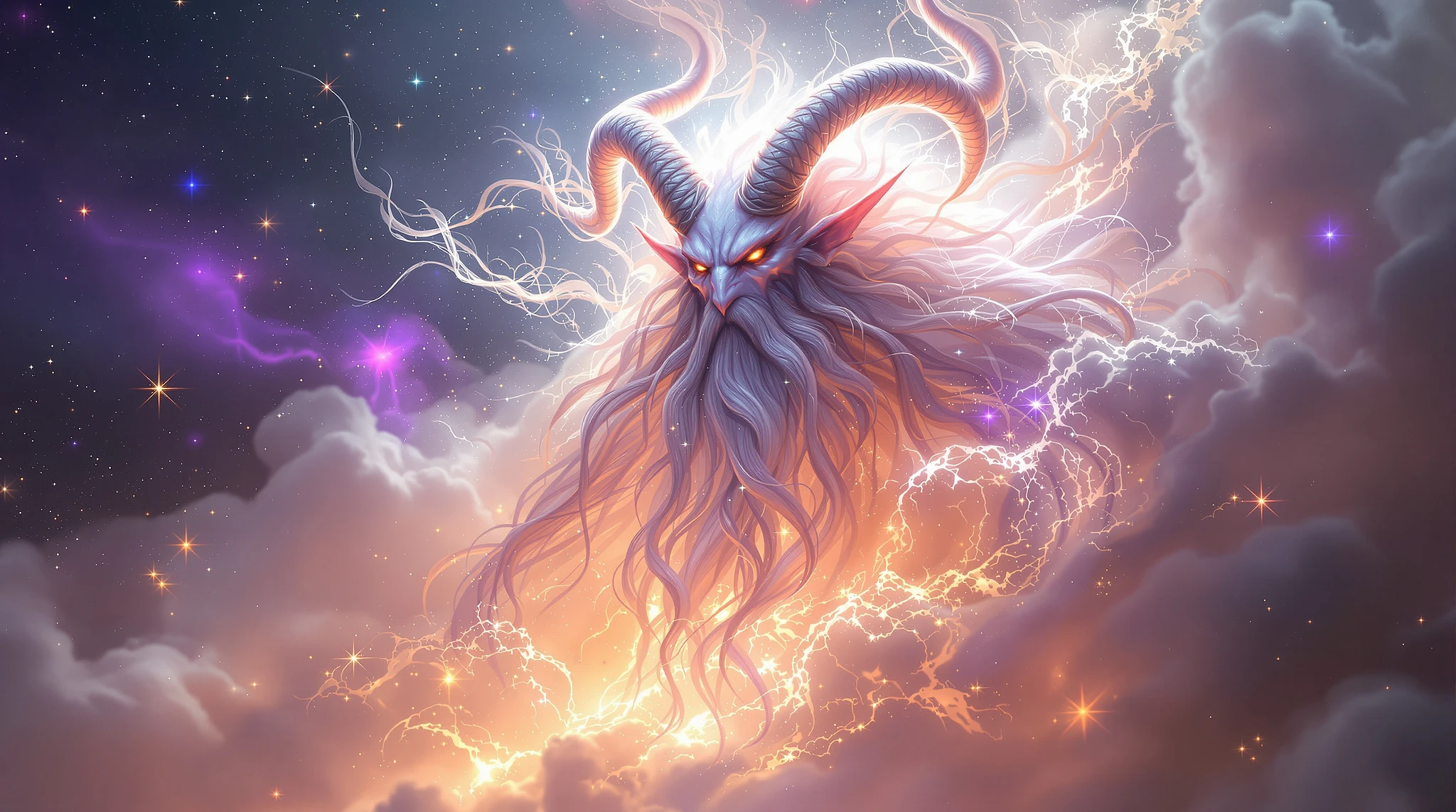 A majestic, the figure evokes ancient wisdom and mythical power, which dominate the scene. With, curved horns and a long, floating beard, The color palette consists of cosmic colors and luminous whites. Its shape is composed of nebulous tendrils, which dominate the scene with their impressive presence, giving the impression of a being born from the cosmos itself. which blend perfectly into the surrounding environment, This composition Dreamlike evokes a feeling of mystery and wonder. The lighting is soft, almost supernatural, with subtle touches of light reflections that accentuate the supernatural aura of the creature. An ethereal entity emerges from a swirl of mist and light, , creating a delicate contrast between light and shadow on the muscular structure of the entity {x} as if the viewer had stumbled upon a celestial guardian or the manifestation of a celestial myth, wandering in the infinite extent of an invisible universe.