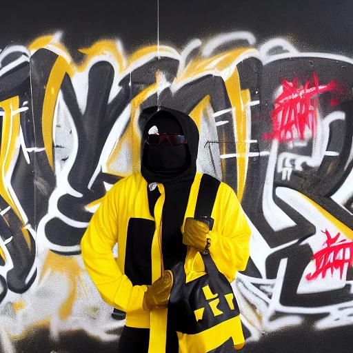 A black man in a yellow bruce lee suit superhero suit with gold gloves and yellow boots, black sunglasses with a red ski mask and holding two spraycans in front of a black wall with graffiti with the word ZOZ