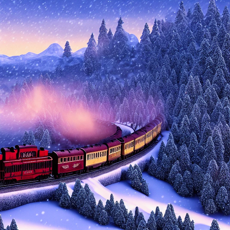Pixar style, steam locomotive train running through the snowy mountains, the polar express, scenic landscape, stunning environment, dusk, mist, realistic, dramatic lighting, highly detailed, intricate, volumetric lighting, dreamy magical atmosphere, vivid colours, photography, high resolution, 4k digital art, ultra wide angle lens, aerial view, wallpaper --ar 3:2 --v 4