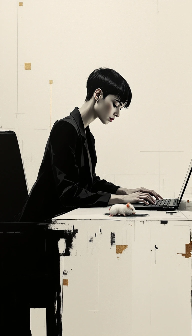 A cinematic abstract painting of a focused woman with a sleek, pixie cut. She is wearing a tailored blazer and straight-leg jeans, sitting at a large desk with her hands hovering over a laptop. A curious, white hamster is exploring the desk near her keyboard. The artist uses stark, contrasting colors, such as blacks, grays, and whites, to create a modern and intellectual atmosphere. The sharp, geometric brushstrokes create a sense of precision, while the pale beige background with subtle hints of gold provides a refined backdrop.