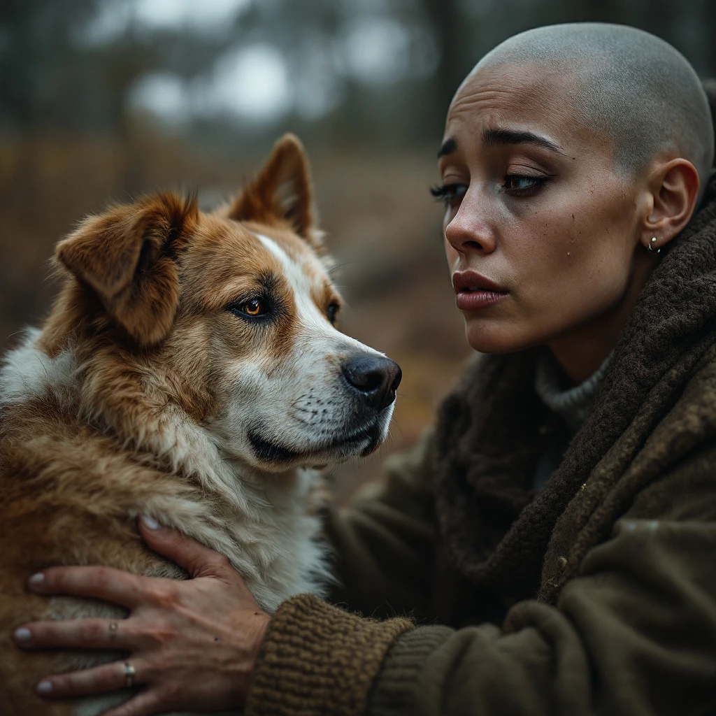 A heartwarming scene of a sad teary eyed bald young woman and a dog sharing a moment of companionship