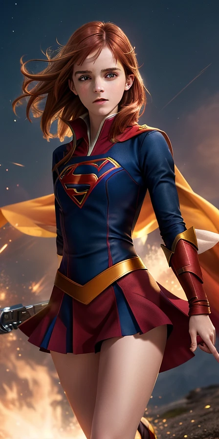 Emma Watson supergirl costume, full body, dressed with legs open, sharp lenses, professional photography, 70mm lenses, lovely details, high quality, Unreal Engine 5, wallpaper, colorful, highly detailed, 8k, soft light, realistic photo. perfectly groomed red hair, her breasts and buttocks stand out