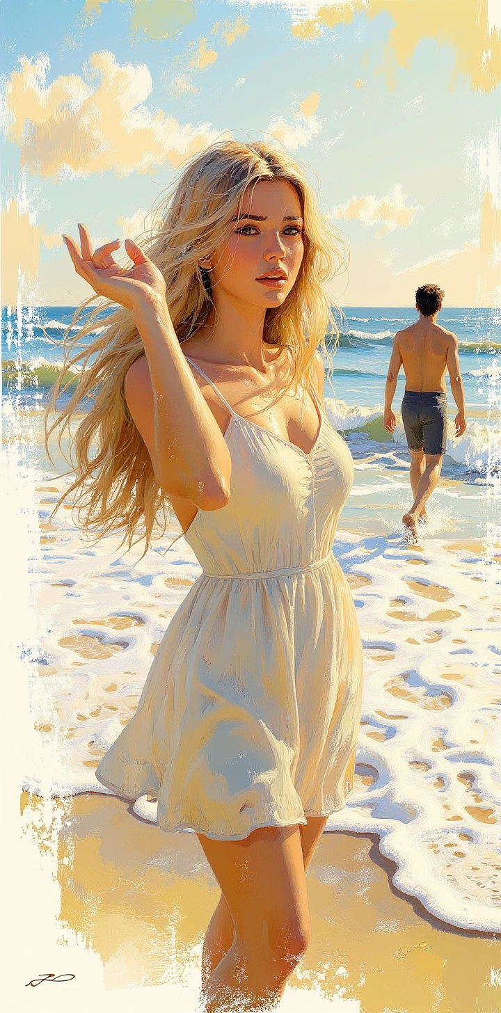 a painting of a blond long hair woman, in the style of brushstroke-intensive portraits, crying, beach, wearing summer dress, waves crashing, she is standing and waving goodbye , in the far a man walking away, cinematic elegance, golden light, flowing brushwork, multilayered realism, feminine themes --chaos 75 --ar 1:2 --profile rsy6uq9 --stylize 750