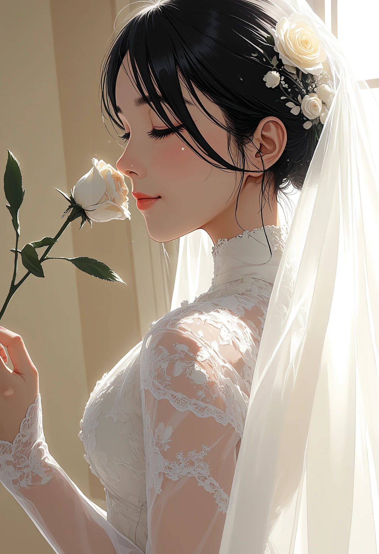 masterpiece, best quality, amazing quality, very aesthetic, absurdres, newest, scenery, anime coloring, flat color, 1girl, solo, asian, black hair, long hair, hair up, side bangs, flower in hair, hair ornament, closed eyes, smile, closed mouth, looking to the side, bridal_outfit, wedding dress, bridal veil, veil, lace-trimmed dress, transparent_sleeves, high collar, white rose, holding rose, smelling flower, soft lighting, bright light, backlighting, natural_light, high_key, ethereal, indoors, wedding, bride, elegant