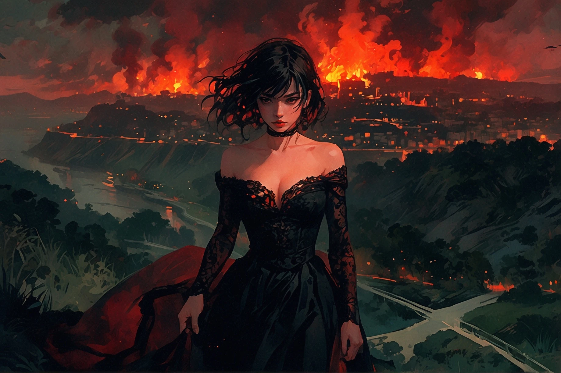 A mesmerizing watercolor impressionist masterpiece featuring a fiery red color palette that envelops a breathtaking cityscape. Towering structures, winding rivers, and lush green hills form a stunning landscape bathed in warm, golden light. A captivating female figure stands in the foreground, her body adorned with intricate details and contrasting colors. Her face is portrayed with vivid features, evoking a sense of mystery and power. The overall atmosphere is a blend of dark fantasy, conceptual art, and illustration, creating a surreal and enchanting scene. , portrait photography, painting, cinematic, dark fantasy, illustration, 3d render, anime, architecture, conceptual art, vibrant, photo