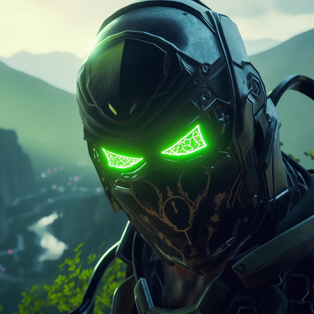 Ninja, intricate robotic details, glowing green eyes, mountain background, Unreal Engine 4, 3D
