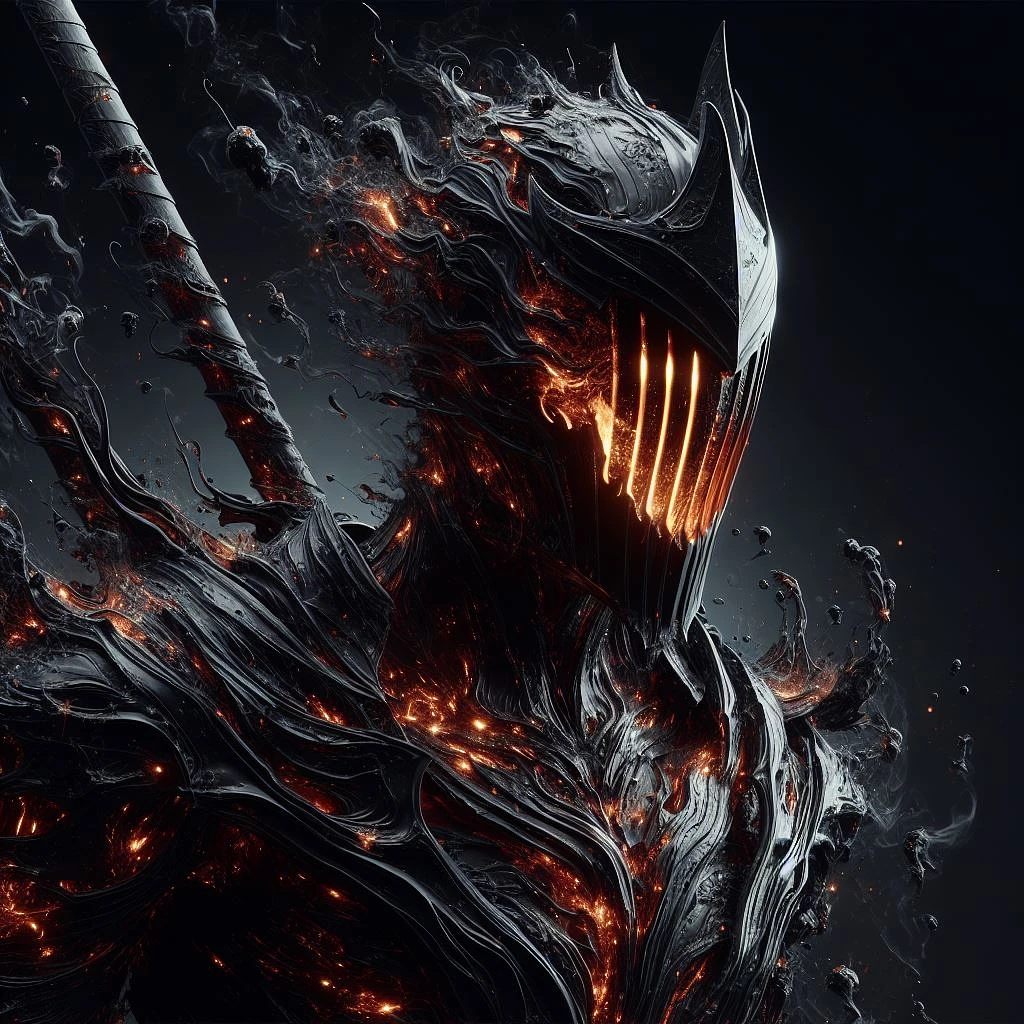 Living darkness warrior, smoldering obsidian armor perfectly smooth reflecting the slightest ray. Behind the visor, two vertical slits revealing a burning gaze. Combining motion capture and real-time 3D rendering for hysterically fluid movements. Slicing through the surrounding air with sharp shadowy specters textured by volumetric ray casting. All in shades of absolute black on a nightmarish backdrop.