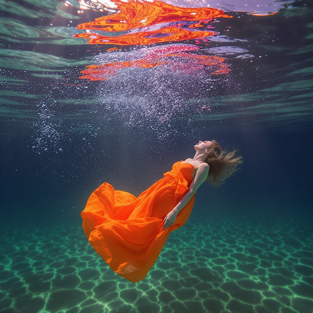 A woman in a orange dress gracefully floats underwater on her back, illuminated by beams of sunlight. The serene scene captures tranquility amidst rippling water, evoking a sense of calm and freedom. #orangedress #sunlight #tranquilityimpressionism #underwater #woman