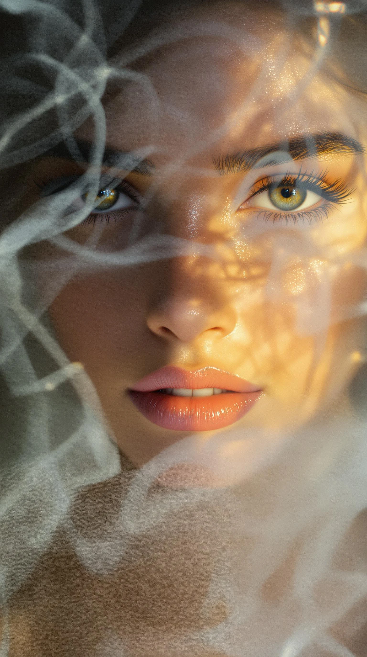 "Shadow & Light professional fine art photography. A model's portrait. Soft pastel colours, gentle lighting. Half her face is in shadow, the other bathed in soft pearl white and warm yellow, amidst swirling mist. Her piercing gaze and subtle sheen of perspiration are highlighted. "