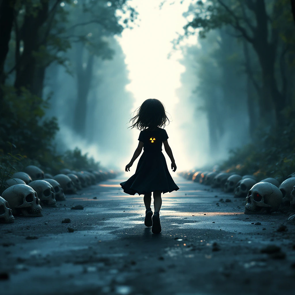 Digital illustration, a small girl in black dress with a geiger counter on her chest walks down the dangerous road with skulls on the side of the road, highres, cinematic angle, dynamic light back shining,
