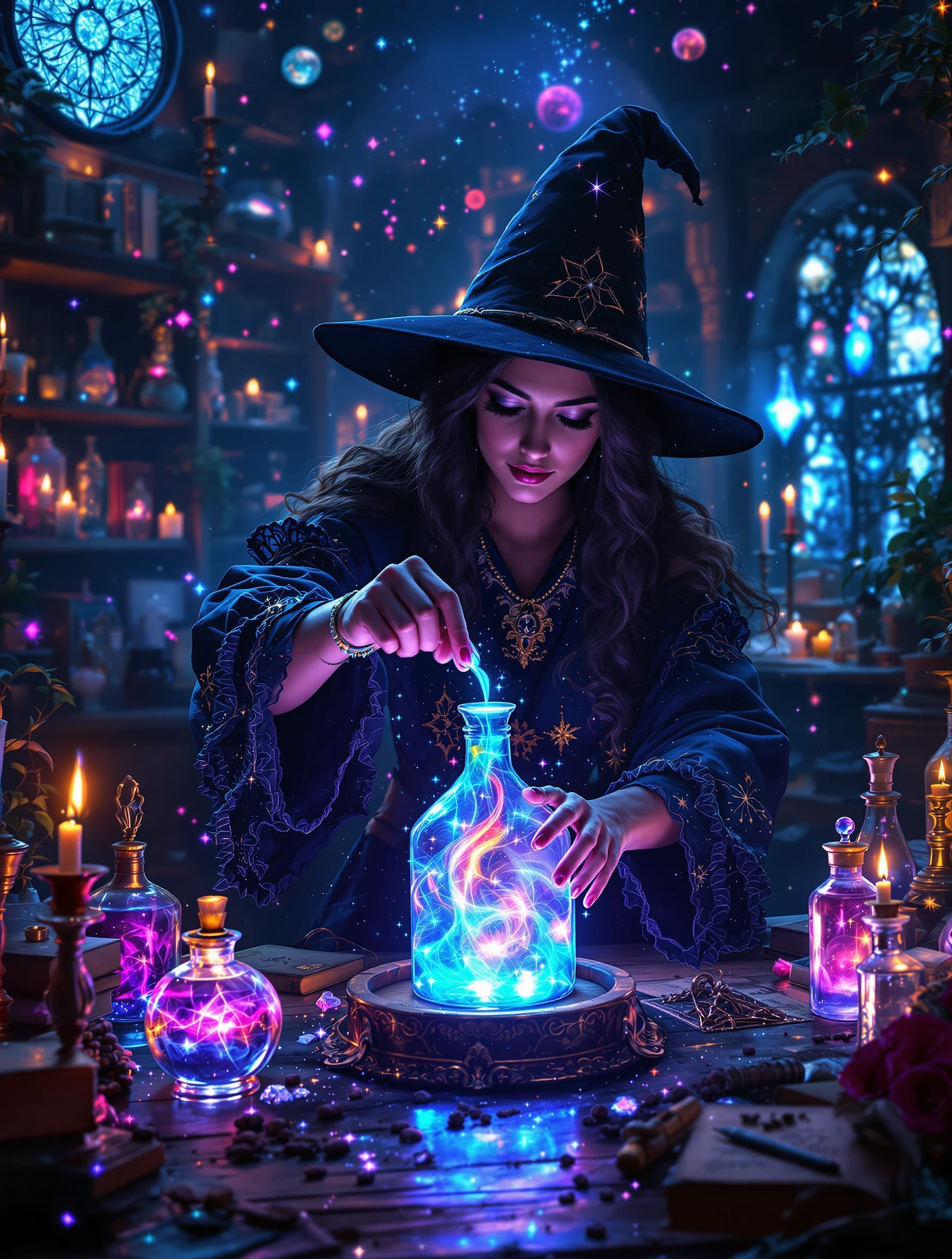 A **mystical witch’s potion room**, dimly illuminated by the **ethereal glow of enchanted candles and floating orbs of light**. Shelves overflowing with **ancient tomes, crystal vials, and arcane ingredients** line the walls, exuding a sense of **wisdom and mystery**.