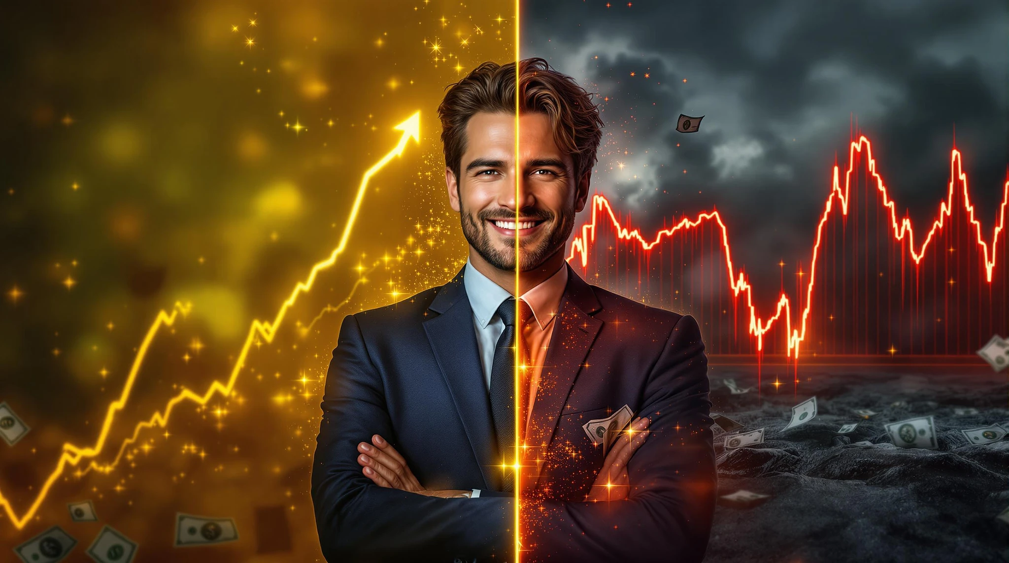 YouTube thumbnail, split vertically down the middle: on the left side, a clean-shaven young man in a tailored navy blue suit, standing confidently with arms crossed. He is smiling with glowing eyes, in front of a glowing gold stock chart rising steeply, sparkling effects around him, and soft green and gold lighting. His side has a luxurious golden background, with a faint image of dollar bills and stock tickers. On the right side, the same man but aged, disheveled hair, unshaven, wearing a wrinkled grey hoodie, looking stressed with dark circles under his eyes, holding an empty wallet. Behind him is a red crashing stock chart, torn paper money, and stormy grey skies. His background is dark, cold, and desaturated. Include intense lighting contrast, cinematic lighting, sharp resolution, high realism, aspect ratio 16:9, designed for YouTube thumbnail clarity at small sizes.