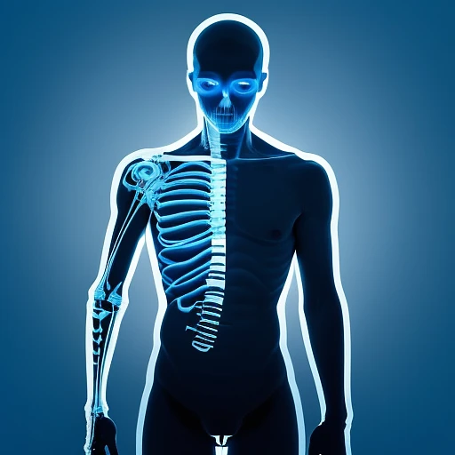 digital art, man wearing a minimalist, white shirt, utilize X-ray effect to subtly display his skeletal framework in a glowing blue, contrasted against a thermal backdrop that shades from icy blues at his extremities to intense reds at his torso, depicting body heat, artistic representation merges minimalistic style with advanced imaging techniques to explore the interplay between external appearances and internal realities, 4K, rich detailing --ar 9:16 --quality 2 --style raw --stylize 300 --v 6. 1