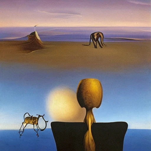 surrealistic salvador dali man overlooking landscape with white elephant at horizon