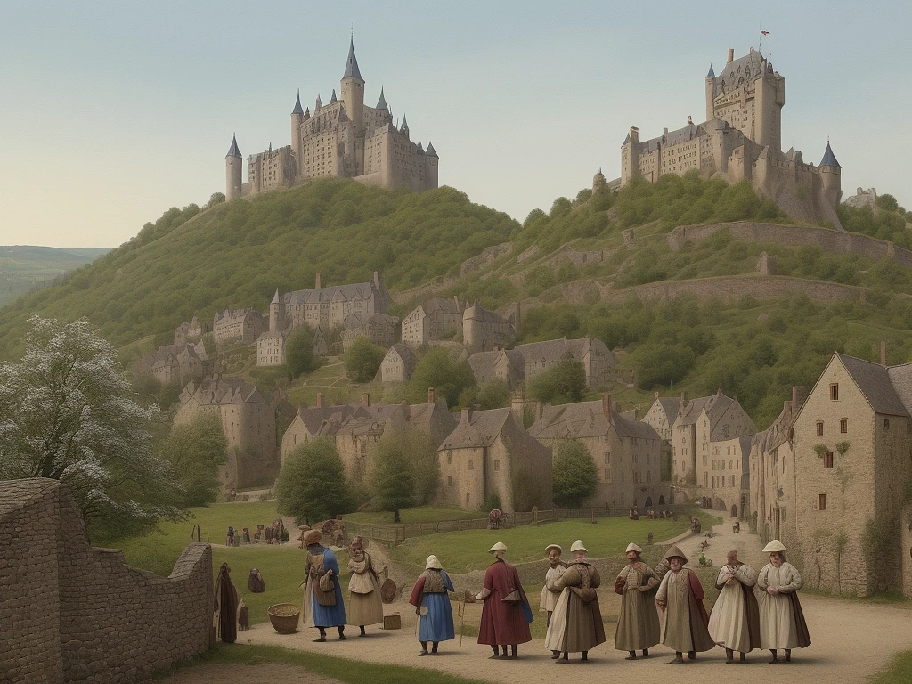 a medieval village with a castle in the background, showcasing a scene of everyday life in a bygone era. The villagers are dressed in attire typical of the medieval period, with tunics, cloaks, and hats, and some are carrying various items such as baskets, tools, and a stretcher with a wounded person. The castle looms in the background, its stone walls and towers a testament to its grandeur and importance. The sky above is cloudy and foreboding, with a sense of drama and tension. The wide-angle camera perspective captures the entire scene, from the villagers in the foreground to the castle in the background, creating a sense of depth and context.