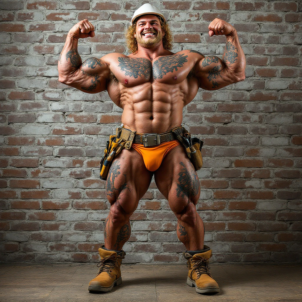 Full body image, tall young bodybuilder, heavily tattooed, chiseled face, chiseled jawline, blonde curly hair, white hard hat, big penis in orange thong underwear, tool belt, big feet in brown work boots, big smile, flexing both arms, standing against brick wall