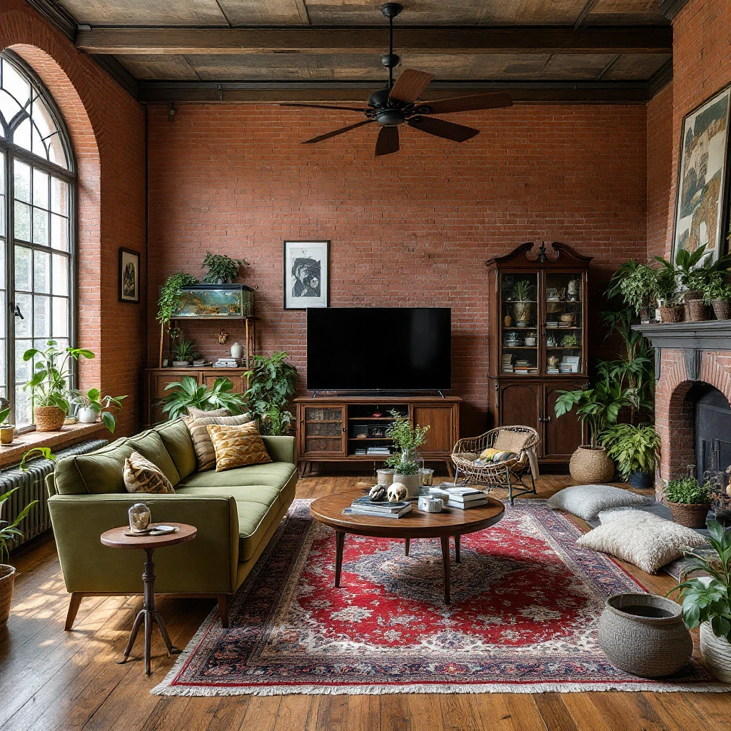 Brick walls, large factory window, old hardwood floors, olive green mid-century sofa with dark wood legs, freshwater tropical fish tank on dark walnut stand, large flat-screen TV with dark walnut TV stand, red Persian rug, round antique coffee table with art books skull glass cloche and oddities, curiosity cabinet with specimens, lots of house plants, large Norfolk island pine, wood burning fireplace, lots of bohemian pillows, dark wood ceiling fan