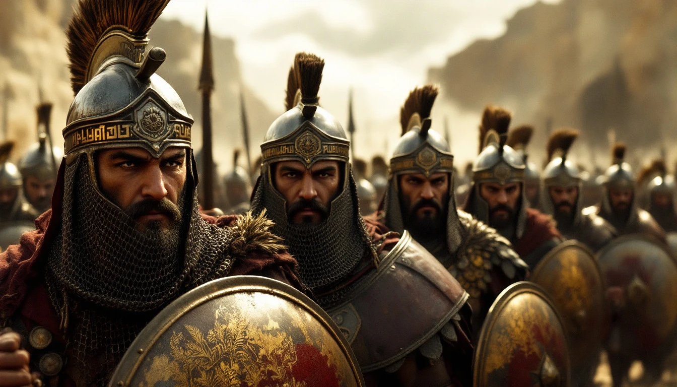 Ultra-realistic. 31. Medium shot of a small group of warriors following Parushat, weapons in hand. [Warriors: Achaemenid Persian faces, in period armor, each wearing a dome-shaped Achaemenid helmet with engravings and chainmail veil.]