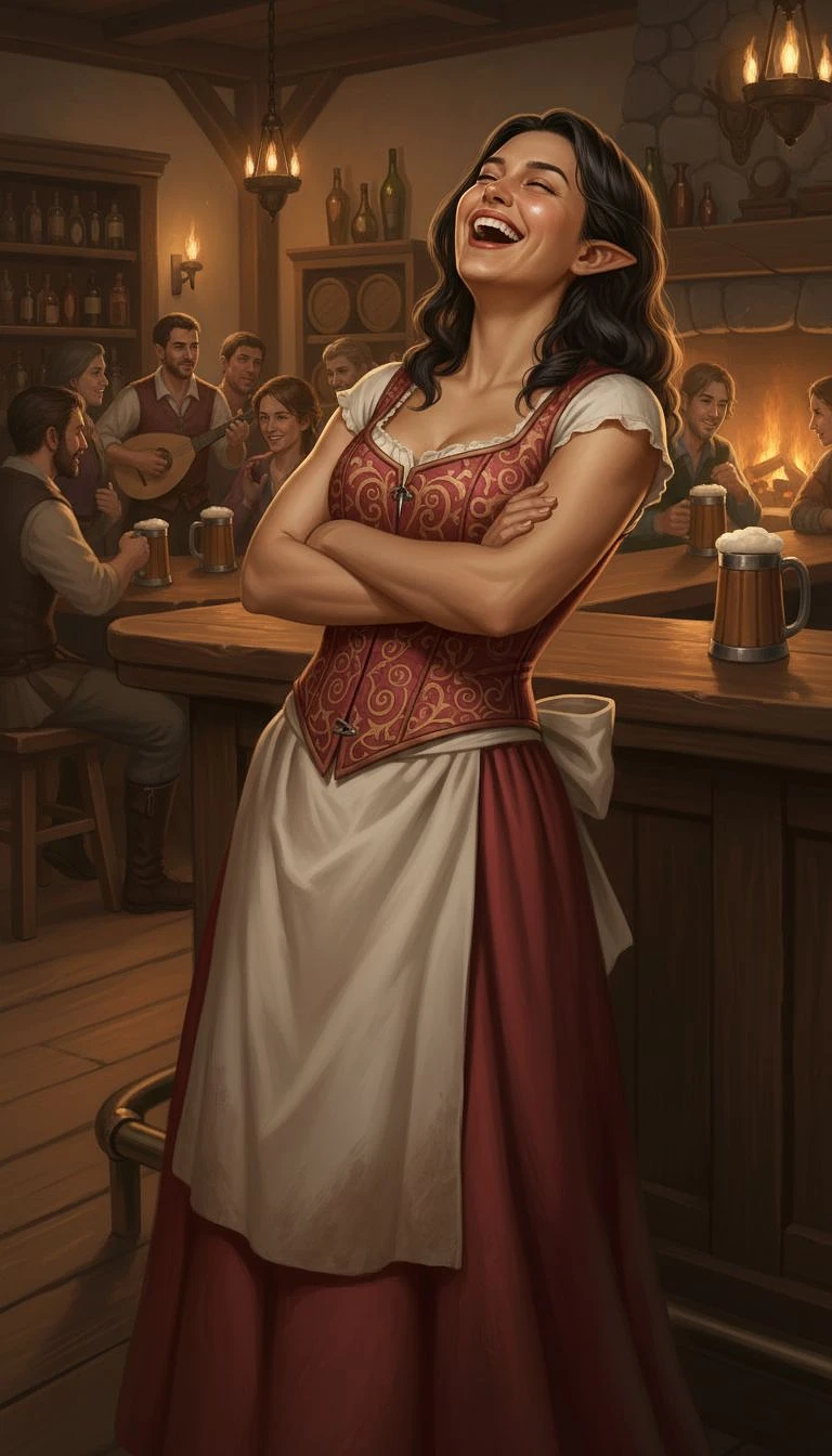 close up of a photorealistic photography [full-body shot] of a fantasy-style [Sylvara - Tavern Elf Barmaid] leaning casually against a wooden bar counter while laughing heartily, wearing [a rustic yet elegant red and gold corset dress with ornate designs, an apron tied around her waist, and a joyful expression] with a vibrant [cozy tavern alive with storytelling and clinking tankards] background, she is Delightfully cheerful, in the style of realistic [Dungeons & Dragons NPC illustrations.] --ar 9:16 --style raw --profile q44dveb --stylize 500 --niji 6