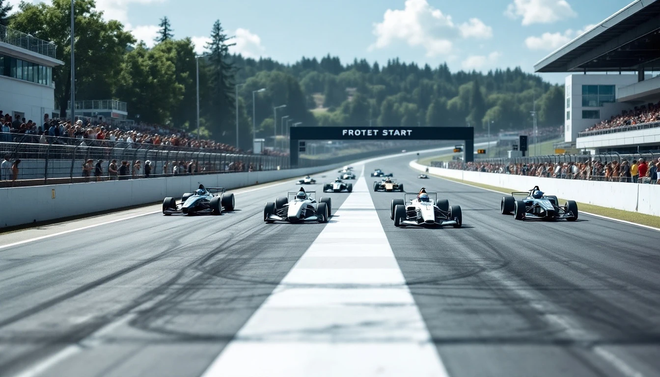 Summer. At the start of the race track (White stripe across the track) there are 5 (five) racing cars. There are no other cars on the track. The track is divided into 5 lanes. Drivers in helmets are preparing for the start, tension in the air. Spectators stand in the stands and behind the track fence. The camera looks from the side and slightly from above at all the cars. Style - cyberpunk.