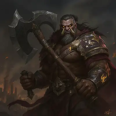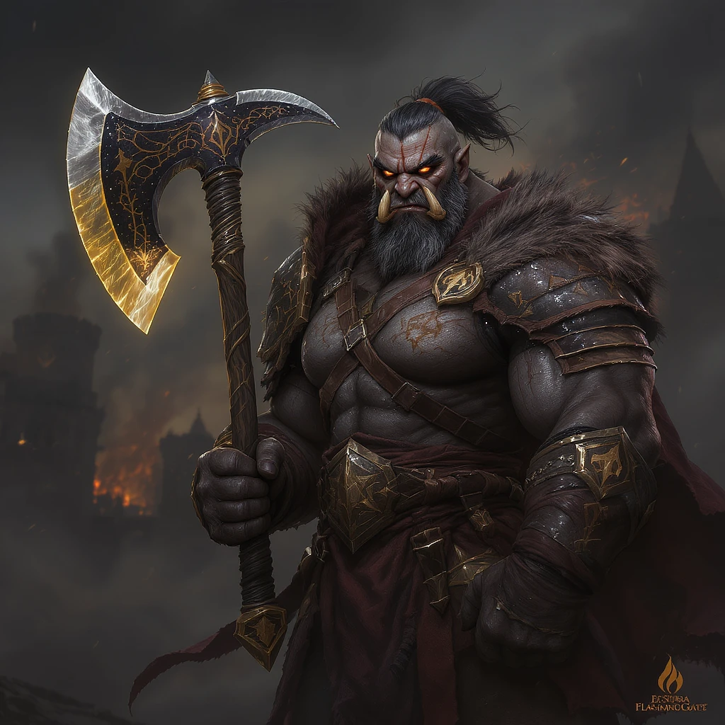 A powerful half-orc barbarian in his 40s, weathered and battle-scarred, with graying black hair tied back and piercing amber eyes filled with determination and loss. He wears practical leather with the Flaming Fist emblem, showing signs of heavy use and travel. In his massive hands he grips ‘Verdetto Finale’ - a perfectly balanced greataxe with Tyr’s scales symbol etched into the blade, the weapon gleaming with faint golden light. His expression is stoic but intense, with prominent orcish tusks and facial scars telling stories of countless battles. The background suggests the outskirts of Baldur’s Gate at dusk, with smoke rising in the distance. Dark fantasy art style, realistic proportions, dramatic lighting emphasizing his imposing presence as a guardian who has lost everything but his duty. Weathered hands show calluses from decades of weapon training. His stance is protective yet ready for violence, embodying both the disciplined soldier and the barely contained fury of a zealot barbarian. He fights with a double handed axe. He is a gentle a good hearted man.
