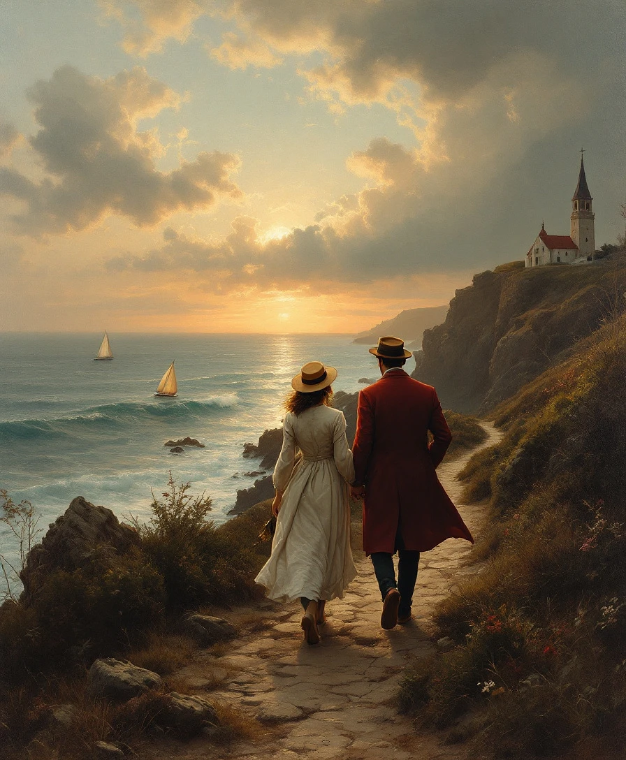 Couple walking along coastal path, (woman: ethnicity:1.0, age:1.0, detailed clothing:1.2, hat:1.1, red coat:1.2, expression:1.0, body type:1.1, pose:1.1, facing away, position:left side center) , (man: ethnicity:1.0, age:1.0, detailed clothing:1.2, hat:1.1, coat:1.2, expression:1.0, body type:1.1, pose:1.1, position:right side center) , facing the sea, (detailed clothing details:1.2) , (accessories:1.1) , (facial features:1.0) , (expression:1.0) , (body type:1.1) , (pose:1.1) , path leading to ocean, dramatic lighting, atmospheric clouds, (rocky coastal path:1.1) , small church/lighthouse on the cliff, vintage style painting, (ocean waves:1.1) , sailboat visible on the sea, (realistic sea:1.1) , warm sunset/sunrise colors with cool tones, overcast sky, oil painting, (detailed rocks:1.1) , foreground to background perspective, shoreline, medium-wide shot, photorealistic style, detailed landscape, soft focus on figures, dramatic atmosphere, calm but powerful seascape, calm but powerful emotions.