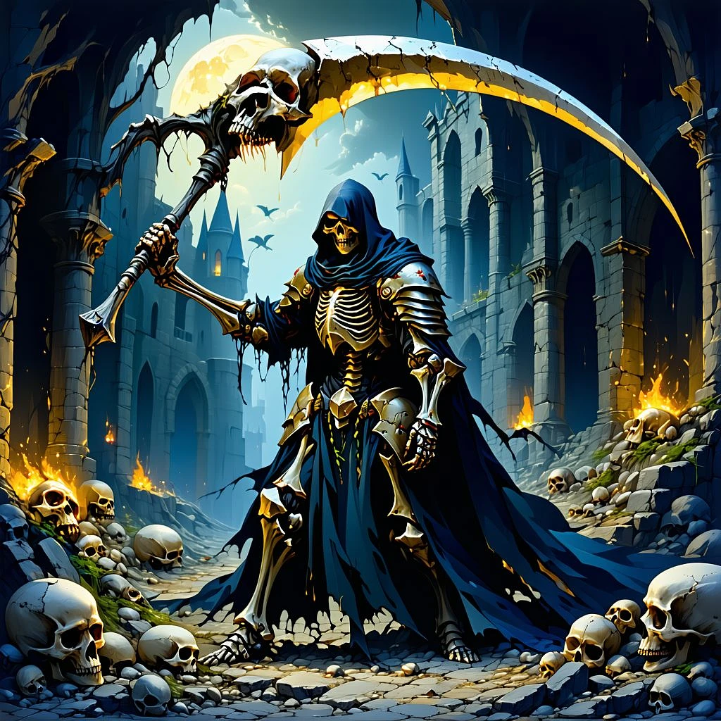 Illustration of the grim reaper fighting in armor plates robes, swinging an extra large scythe made of bones and skulls, dark fantasy, inside an old, dark fantasy city filled with bones and skeletons, wearing a black hooded cloak with gold trim, eye sockets glowing, ultra-detailed masterpiece