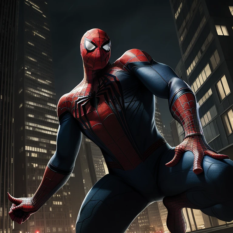 Spiderman with half hulk costume, reddish eyes, urban avenue, modernist buildings from the year 1900, two parked cars, night scene, intricate details, rich textures, wide shot, cinematic, dark lighting, high detail, hd, photo, digital art, fantasy, ((best quality) ), ((masterpiece) ), (high-resolution:1.2)