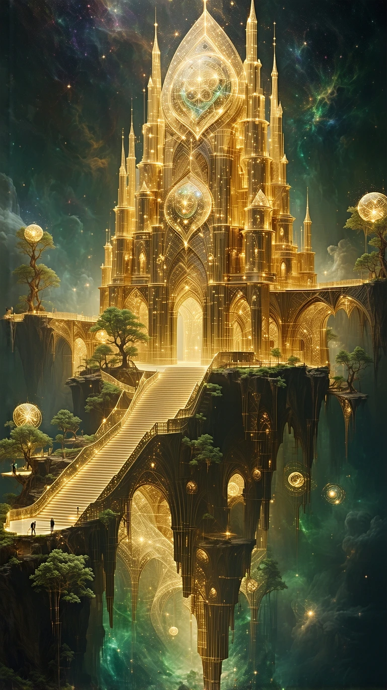 A floating golden citadel, its towers formed from crystalline light, stands suspended in the cosmos. Ethereal ancestral spirits whisper through the winds, their voices weaving through branches of a massive celestial tree that holds **ten luminous pentacles** within its trunk, pulsing with ancient wisdom. This is a realm of legacy, divine wealth, and infinite knowledge, where time bends and reality itself listens. The background swirls with surreal nebulae and dreamlike fractal patterns, embodying the eternal cycle of prosperity passed through generations. Golden staircases spiral toward infinity, bridging dimensions of material and spiritual success. Salvador Dalí-inspired surrealism, intricate celestial architecture, glowing golden fractals, cosmic dreamscape, radiant pentacle formations, cinematic 4K. --avoid: malformed structures, blurry, low-resolution, unrealistic reflections, stretched elements, artificial lighting, bad proportions, cartoonish, low-poly, floating artifacts, watermark, text artifacts.