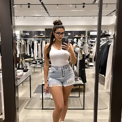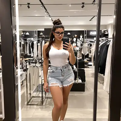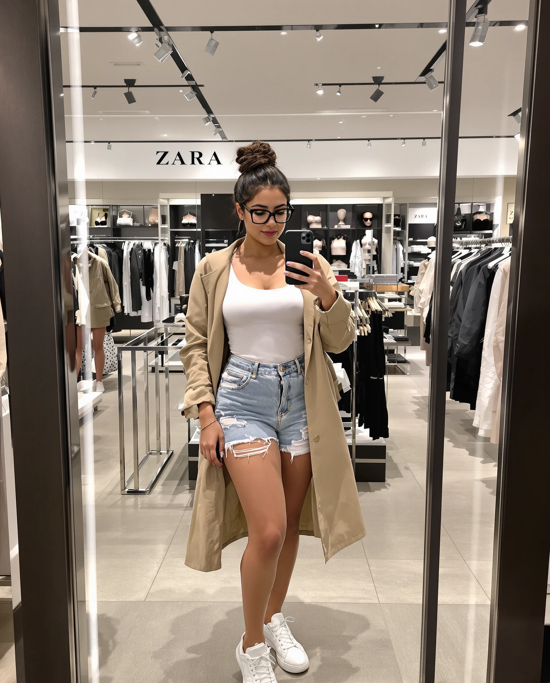"A hyper-realistic, ultra-detailed portrait of a 22-year-old young brunette woman with deep brown eyes and long, wavy dark brown hair tied up in a messy bun. A few loose strands softly frame her well-defined face. She has smooth white skin with a warm undertone, high cheekbones, and full lips. She wears square black frame glasses that rest naturally on her nose, adding an intellectual yet effortless charm. Her expression is calm and composed, with a slight hint of curiosity in her eyes. She wears no makeup, allowing her raw beauty to stand out. She is dressed in stylish, well-fitted light blue ripped low waist mini shorts paired with a form-fitting white tank top, perfectly complementing her naturally curvy hourglass figure, thick thighs, and huge XL breast. Over her outfit, she wears an unbuttoned beige trench coat, adding a chic and sophisticated touch to her casual look. She completes the outfit with minimalistic white sneakers, enhancing the effortless yet chic vibe. She stands confidently in a Zara store, near the lingerie collection section, holding an iPhone 16 Pro Black Titanium in one hand, capturing a mirror selfie. The large, full-body mirror reflects her poised stance and the stylish store ambiance. The background showcases organized clothing racks, neatly displayed lingerie collections, and subtle branding elements, adding to the premium retail setting. The store’s built-in ambient lighting casts a soft, balanced glow across the scene, enhancing realism without additional artificial effects. The composition captures the elegance of the fashion-forward environment, with the mirror adding depth and perspective, making the moment feel immersive and natural. Ensure the fingers are natural, with proper proportions and no extra or missing fingers. Avoid any anomalies in finger placement, keeping them consistent with the pose and maintaining the integrity of the rest of the image. "